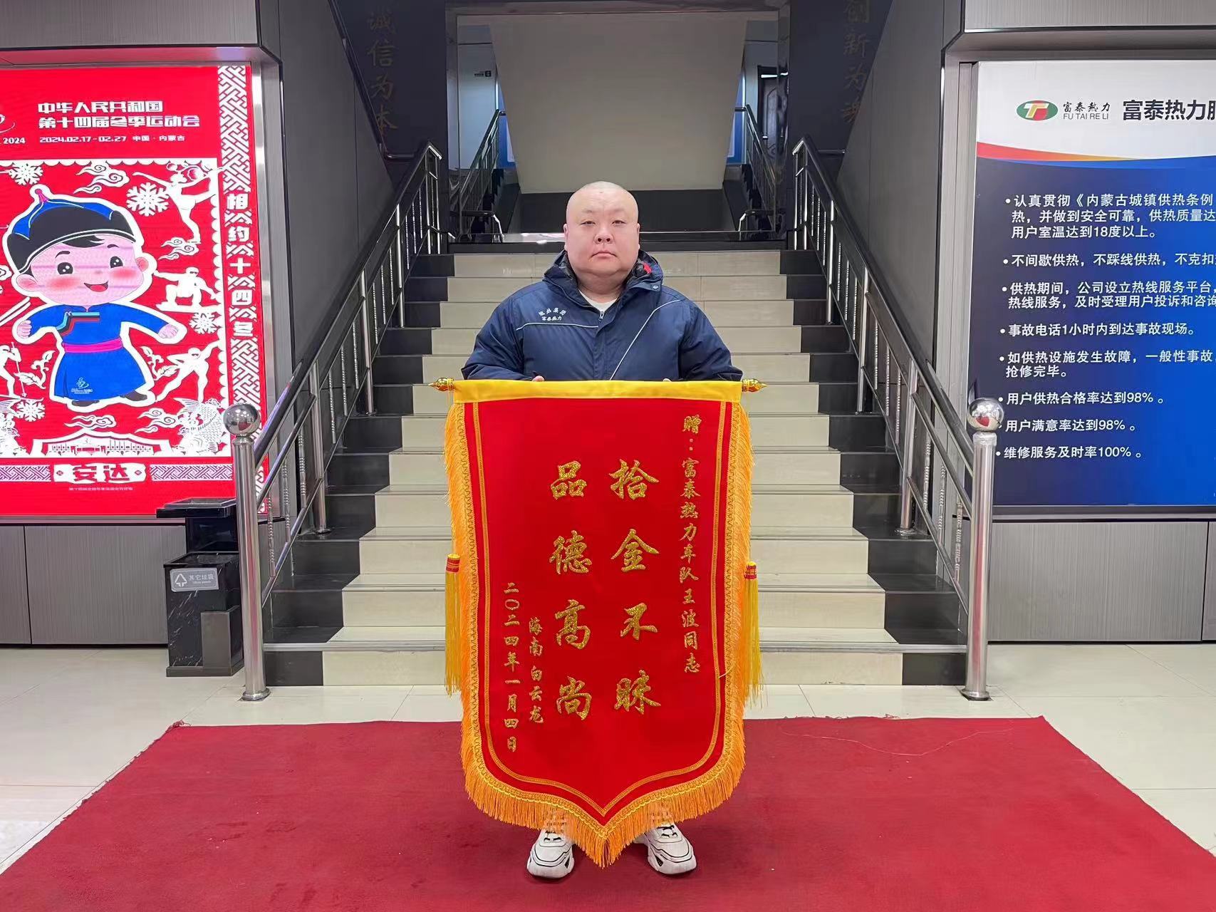 1月9日,海南省來呼辦事的白云龍先生將一面寫有“拾金不昧 品德高尚”的錦旗送到了富泰熱力公司,對(duì)公司綜合管理部員工王波拾金不昧的暖心行為表示真摯的感謝。
